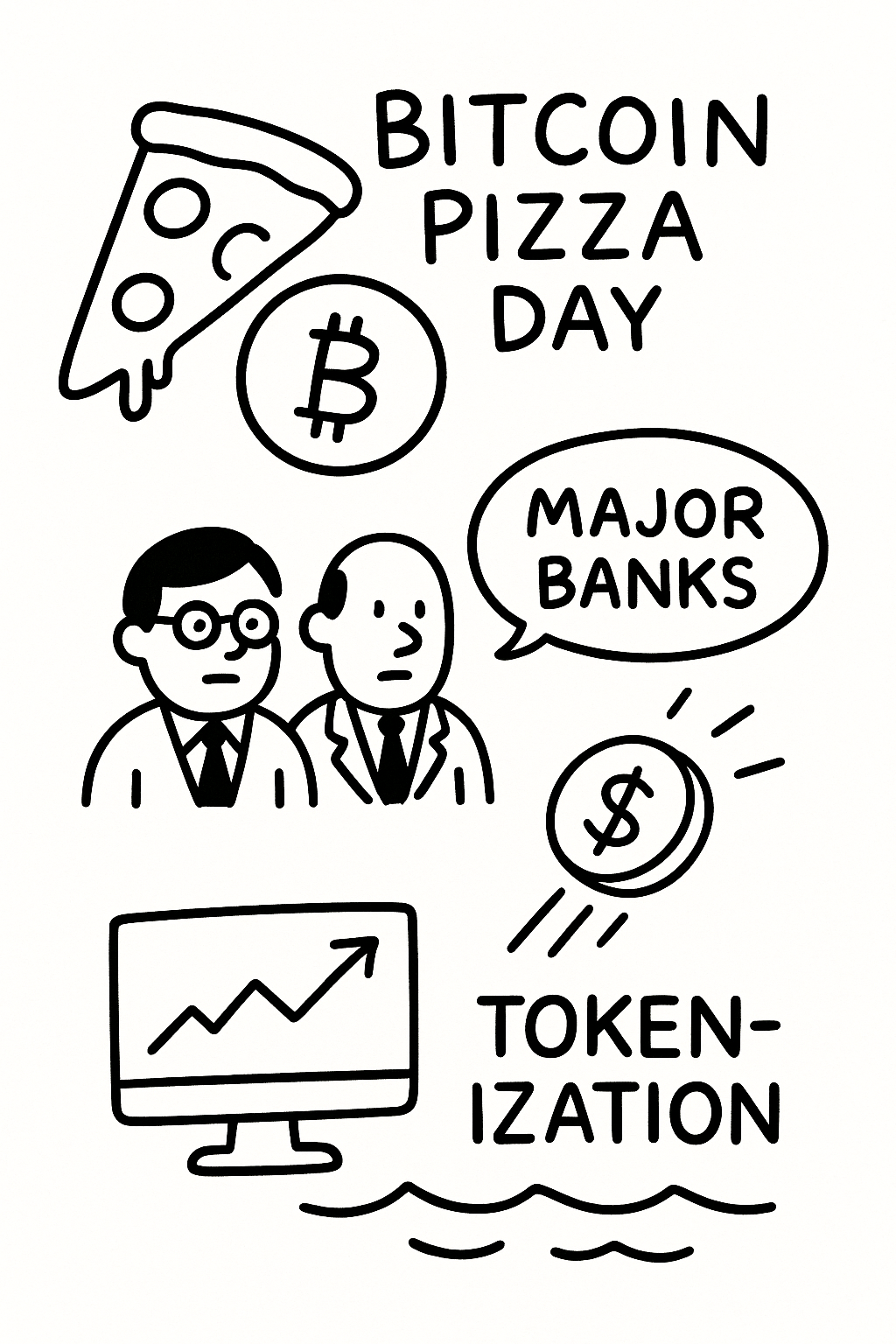 ☀️ 오늘의 크립토! 250523 피자 두 판에 1조 5천억 원?! 코인과 대형 은행, 그리고 24시간 거래되는 주식